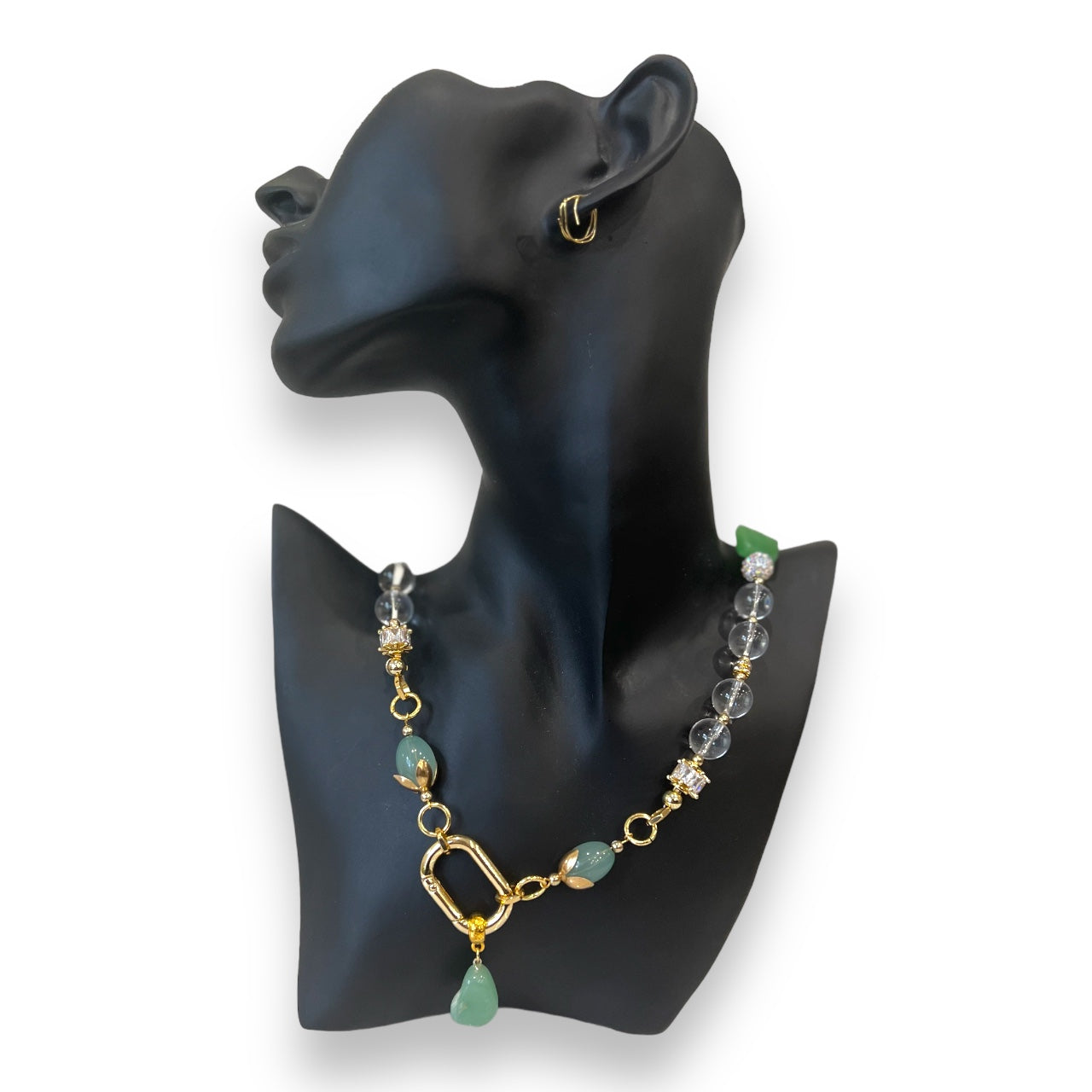 Clear Calcite gemstone necklace perfectly paired with green jade gems and it is known for its powerful crystal of purification and amplification. Its purifying activity cleanses blocks, stagnation, and negativity from our mind, body, energy bodies, and environment.