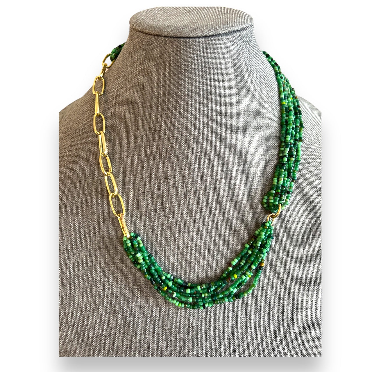 Beautiful mixture of green jade gemstone with gold plated chain.