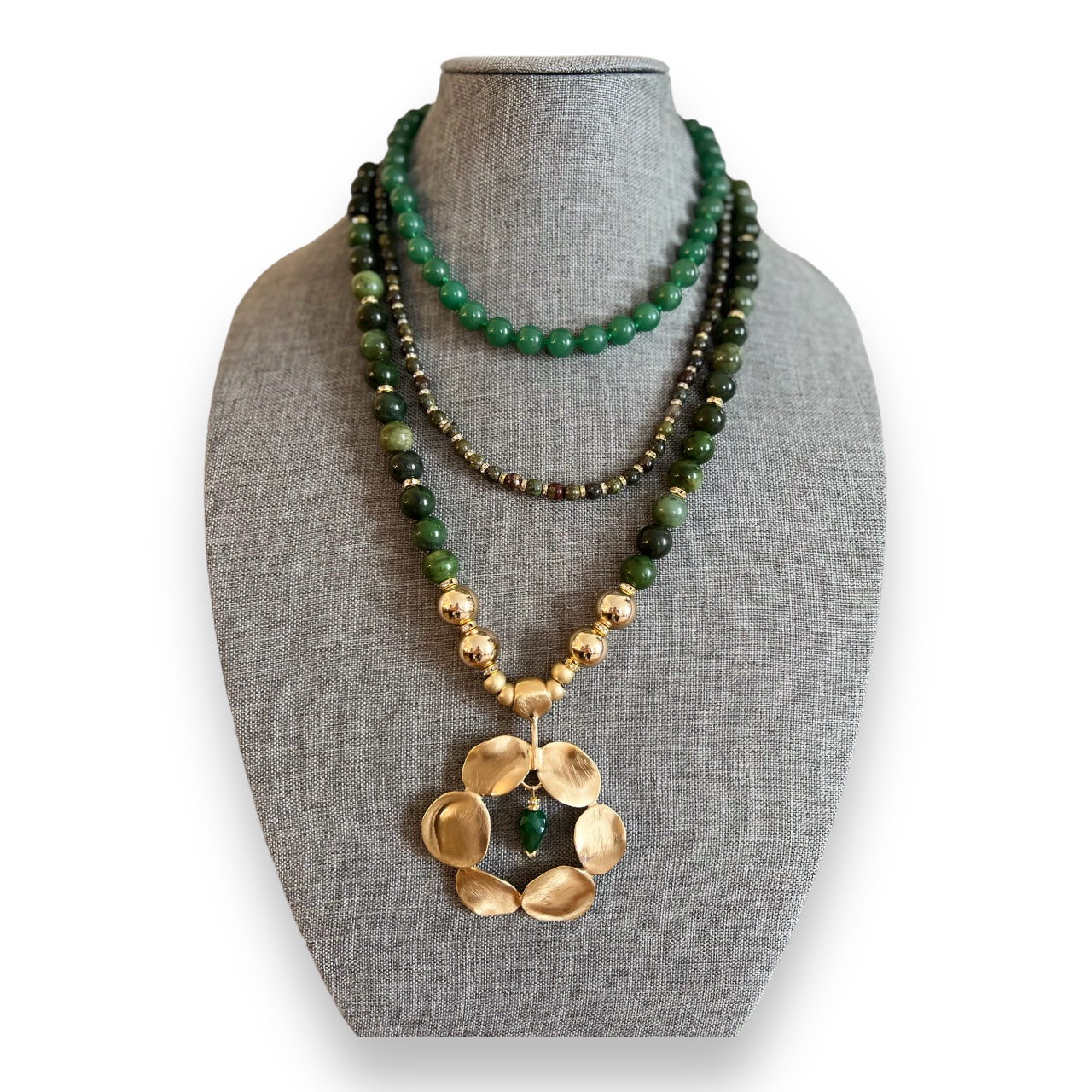 Beautiful layering necklace combination of green jade gemstones and gold plated floral charm. This necklace is a statement piece that will always catch attention.