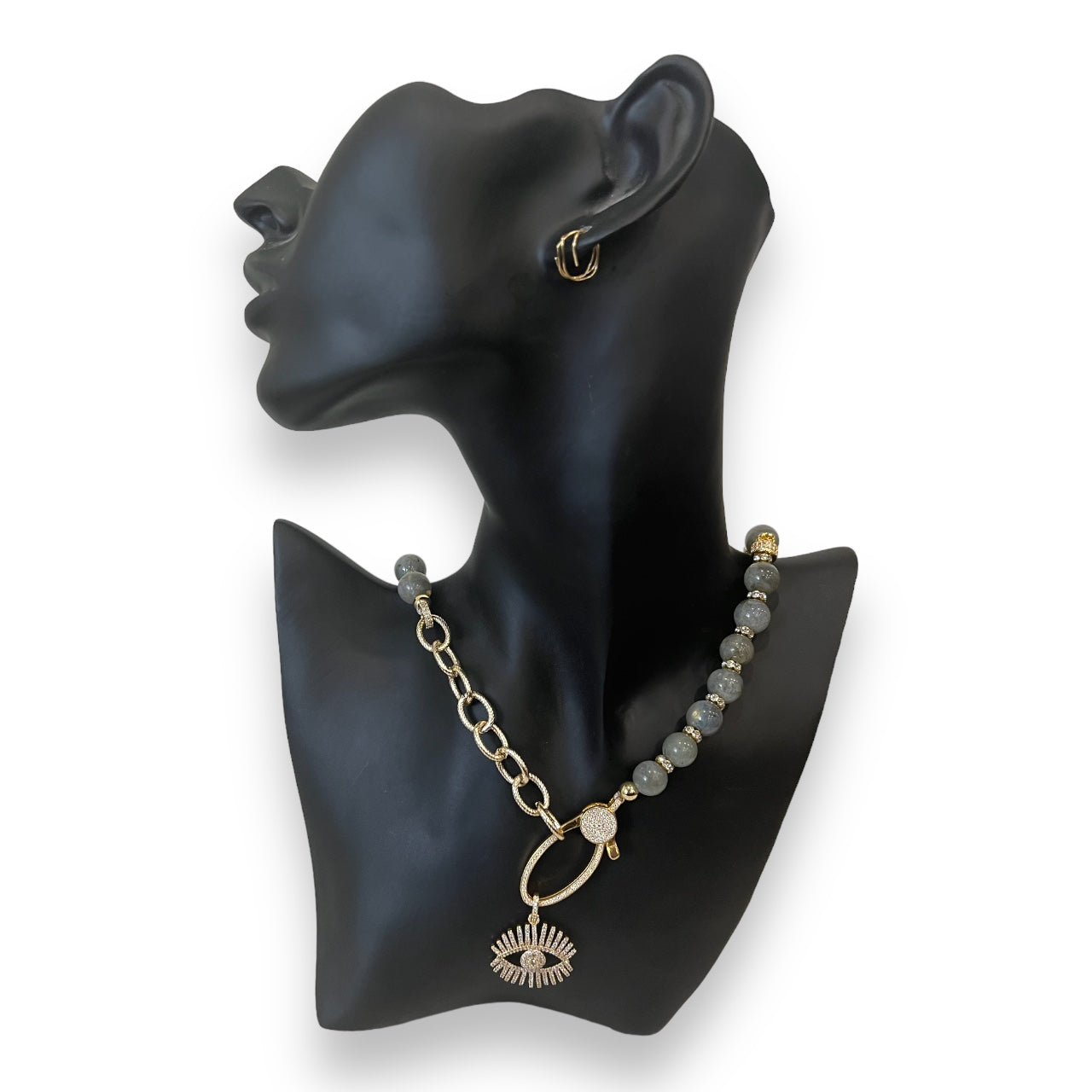 Check out this stunning grey labradorite gemstone necklace! Labradorite is known for its unique iridescence, reflecting flashes of blue, green, and grey depending on the light. The neutral grey tones of this particular piece make it a versatile addition to any outfit, whether you're dressing up for a special occasion or simply want to add some sparkle to your everyday look. With its eye catching chain and unique design this necklace has it all.